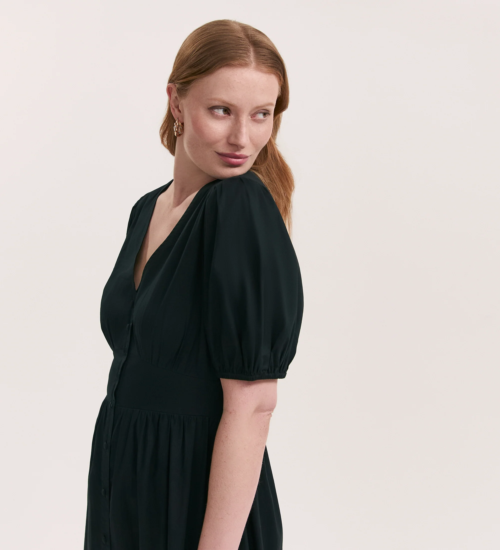 Addison is a black v-neck midi dress crafted from our cotton seersucker fabric. With short puff sleeves, button-down front and a waist seam, she's a flattering yet stylish addition for every wardrobe.