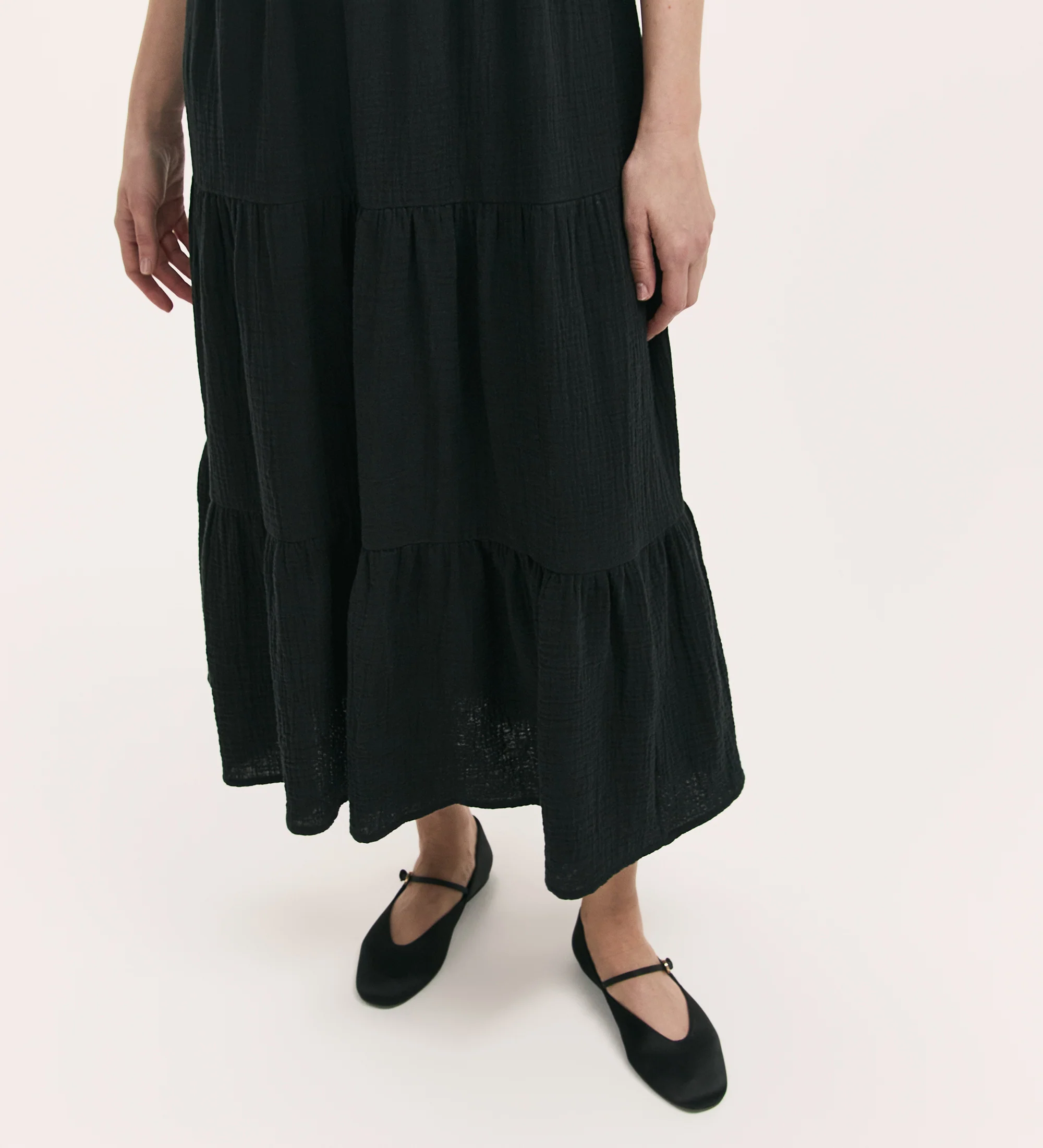 Crafted from a cotton cheesecloth fabric that will keep you cool in the warmer weather, Emmie is a black tiered midi dress with a v-neck and shirred rear detail for a comfortable and flattering fit.