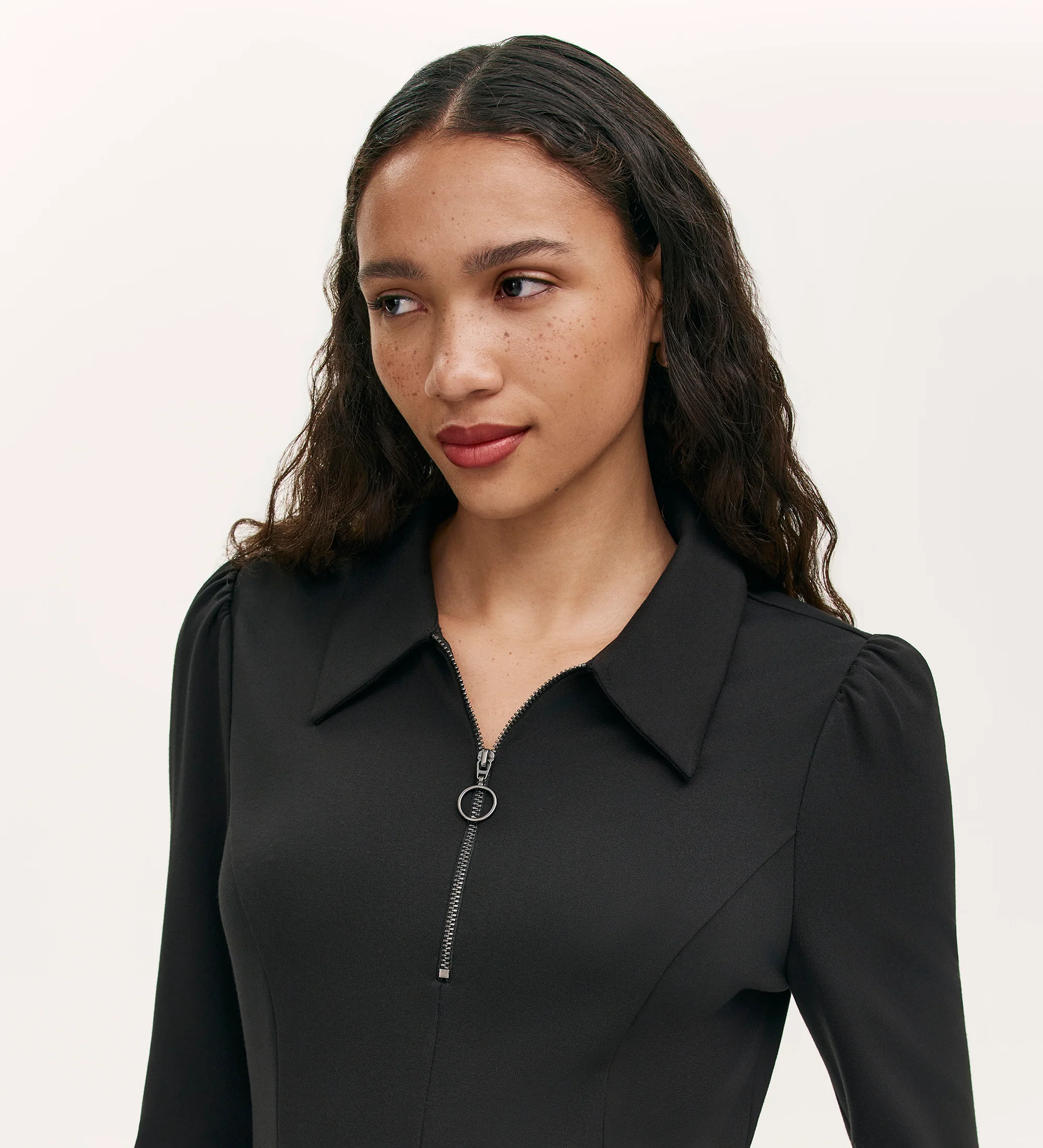 The Lea Dress is a modern mini dress that blends clean lines with effortless wear. Featuring a sharp collared neckline and a functional front zip opening, its silhouette is shaped with subtle princess seams that offer a flattering, contoured fit through the body. Crafted from a structured Ponte jersey, the Lea provides a comfortable stretch with a polished finish. Completed with full length sleeves, it is a dependable and easy choice for any daily rotation.